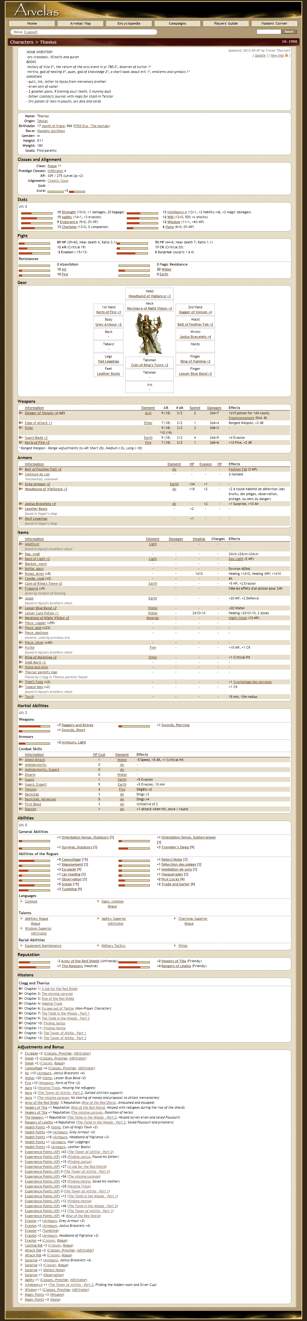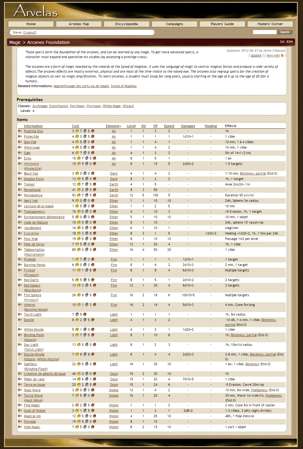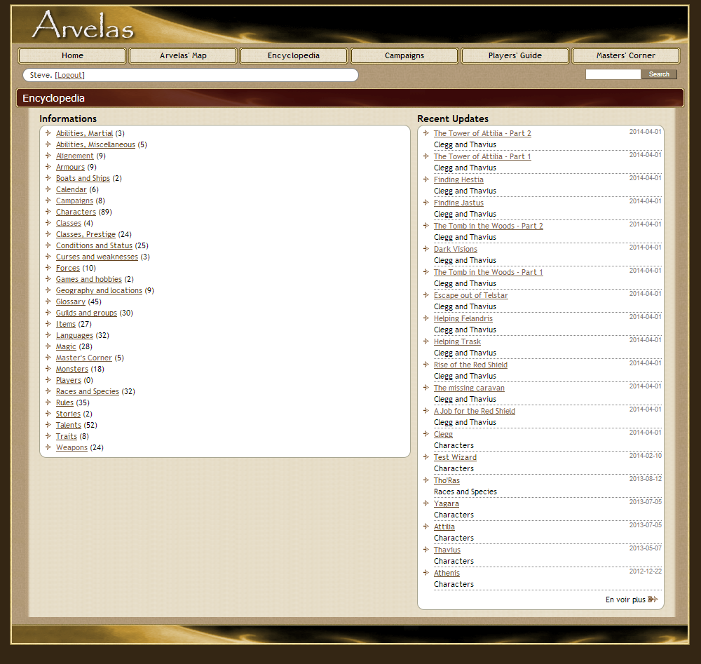 Arvelas migrated to the web in 2008. This first version of the site was mainly in French. In 2010, the site was translated in English, although bits and parcels still remain in French (to be translated as time allows). The transfer happened for a few reasons. First, having the information in a database, managed via a web interface, make the maintenance of the rules and information easier. Also, the rules were constantly being adjusted, meaning they needed to be reprinted each time and shared with the players. A website would let the players keep track of the changes, and also get access to information related to their campaigns. Also, the manager of characters is made easier by the website. This portion of the site is password protection, but probably the one I'm the most proud of. Overall, the website is a win for all.