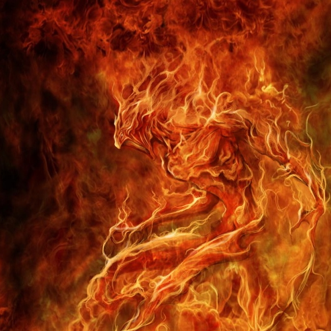 The element of fire is often associated with rage and unpredictability. Being so, the elemental of fire is often aggressive, and prone to attack and burn. It has a vague humanoid form, with long thin arms and fingers, and an elongated snout resembling a beak. It moves along the ground although it can jump at impressive heights and distances. Because of its temper, the fire elemental is not often used as a guardian.